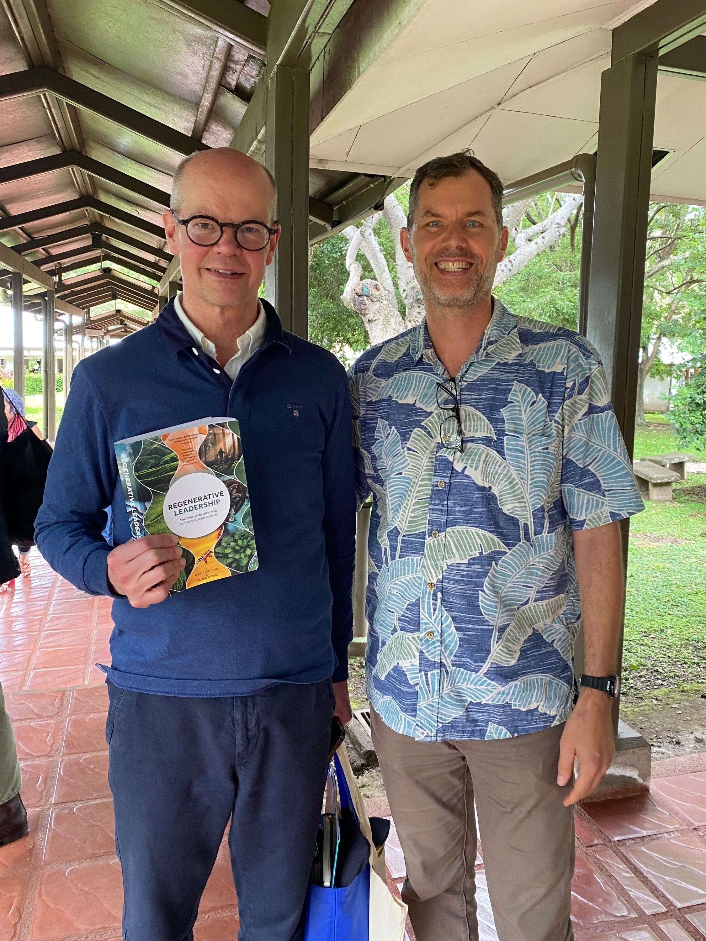 On the left the IBO Director General, Olli-Pekka Heinonen receives a copy of Regenerative Leadership from Theo Wyne, an IB DP teacher at UWC Costa Rica. Theo asked Olli-Pekka to deliver the book personally to Jan Dijkstra at Ecolint in Geneva, Switzerland (right photo).